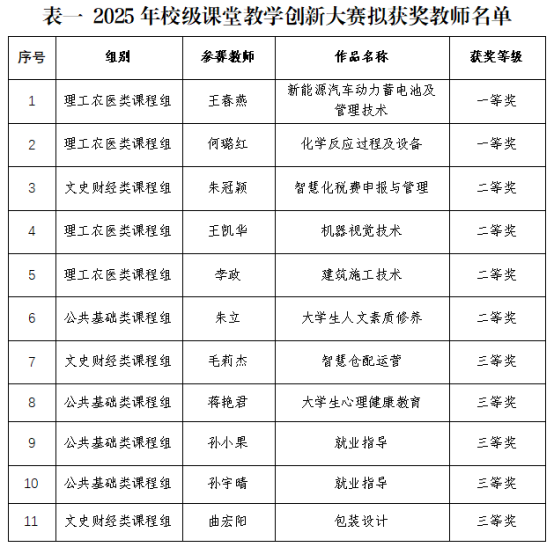 教务处特邀5名校内外专家组成评审组,严格依据《2025年河南省高等职业教育课堂教学创新大赛评判标准》进行专业评审。共评选出校级获奖教师11名,其中一等奖2名、二等奖4名、三等奖5名,获奖名单如表一所示。